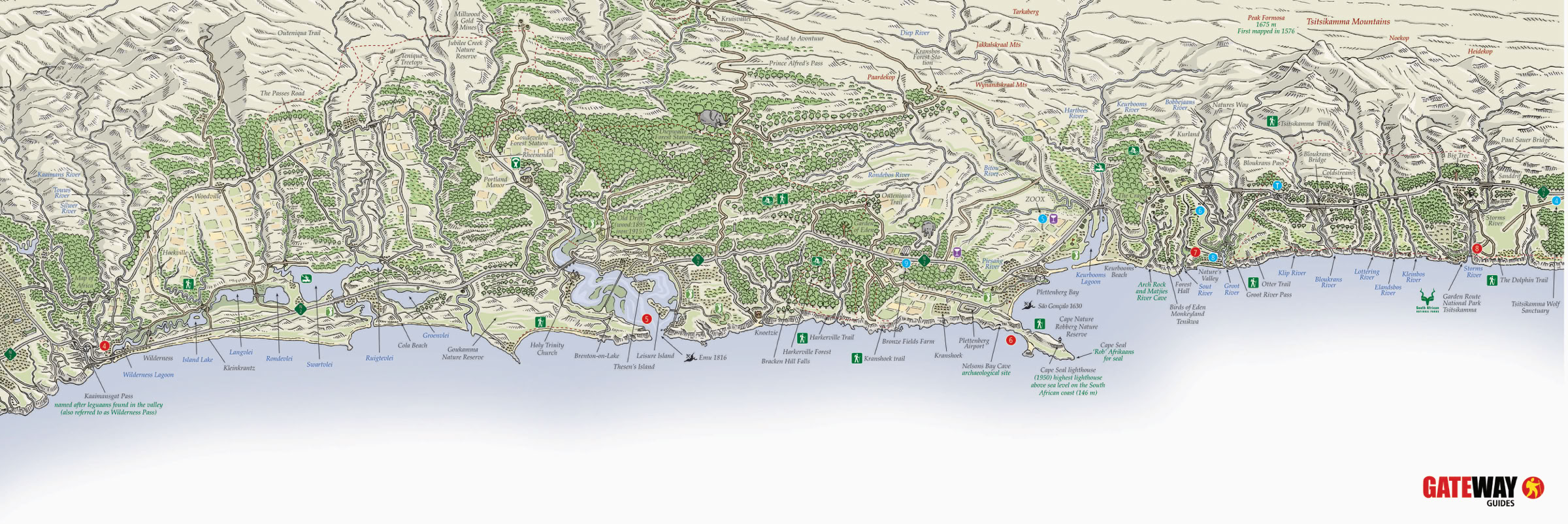 The stretch from Keurbooms River to the turn-off to Nature’s Valley has become a tourist area known as The Crags, with one of the youngest wine routes in the country and wildlife and bird centres. Zip-lining, kloofing, horse riding, hiking and polo are on offer here. Nature’s Valley, which offers the only beach and lagoon in the area, started out as a farm owned by Hendrik Barnardo (foreman of Bain’s team at Groot River). He went to extreme lengths to protect the trees, but one of his family was credited with shooting the last Tsitsikamma elephant in 1881. From 1941-3 he sold land to a syndicate of 10 families and to Baron Ulrich Behr, who officially named the place Nature’s Valley when a township was declared in 1953.