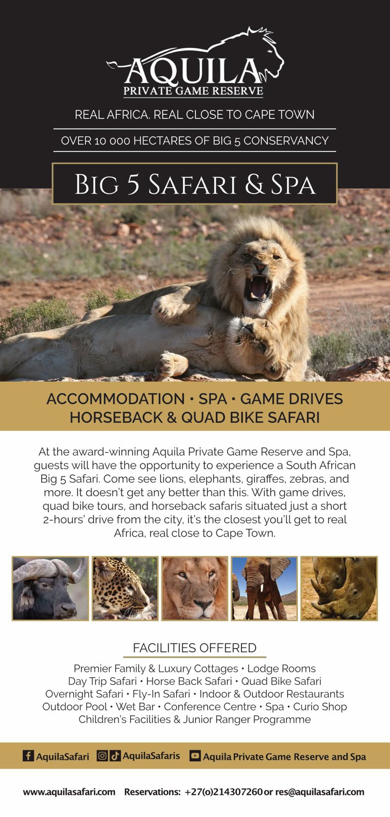 This is a premier Big Five game park, located just 2 hours from Cape Town. Besides game viewing, Aquila offers top luxury for both day visitors and overnight guests.