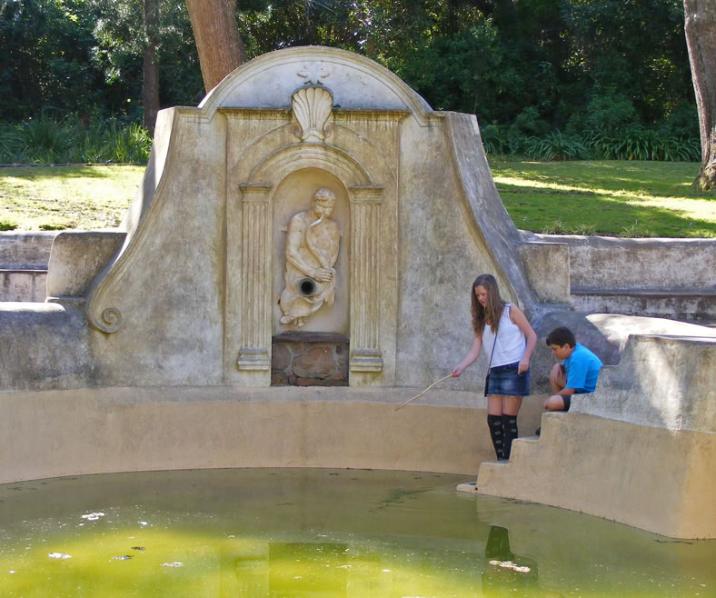 The oval bath has its own scrolled gable with a niche containing a figure of Triton, flanked by pilasters and two built-in benches.